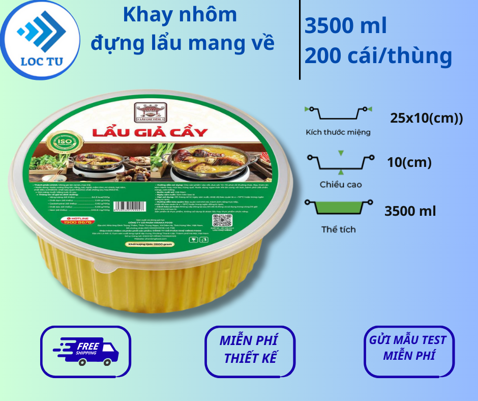Trả lời: Lộc Tự cung cấp nhiều kích thước khay nhôm lớn. Các size phổ biến cho món lẩu như 2000ml, 3500ml… hoàn toàn có thể phục vụ các set lẩu cho 2 người, 4 người hoặc thậm chí 6 người ăn. Vui lòng liên hệ để chúng tôi tư vấn kích thước phù hợp nhất với suất ăn của quán bạn.